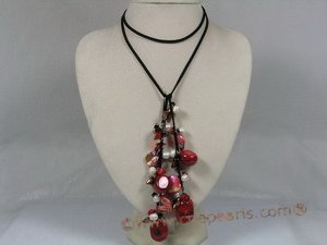Elegance rubber cord necklace featuring oval shape coral beads;alternated with 7-8mm white whorly freshwater pearl and shell beads;link by a black rubber cord; 36 inch in length;no clasp; can wear and tie it in any way as you like. Buying similar style necklace: leather cord necklace or ribbon necklace or long necklace