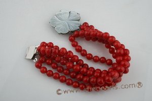 This elegant Red Coral jewelry set consist of a 17inch coral necklace and a 7.5inch bracelet; This set deisgn in 6mm round red coral beads in five strands. Each bead is double knotted with durable silk thread for beauty and security, end with silver plated carve flower shell clasp ; Great gift for every one!