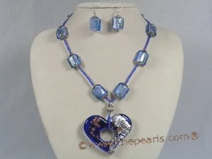 Fashion lampwork jewelry set conist of a 16inch necklace and a pai of sterling dangle earrings, made of bule glass beads and 15mm square lampwork beads, set a 50*55mm bule heart shape pendant in the centre! the necklace end with silver lobster clasp;