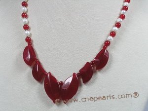 Summer jewelry Collection--gradual change jade necklace made of red gradual change leafe shape jade beads, alternated with 6-7mm white potato pearl. with silver plated beads as spacer; end with silver plated or 925 silver lobster clasp, wearing length is 16";