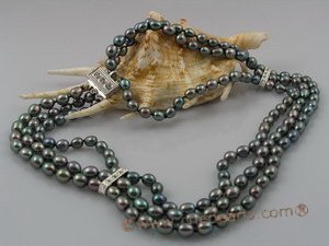 An exquisite necklace consisting of three strands peacock genuine rice shape pearls, and two pieces shiny zircon inlayed spacers. The pearls measure approx.6-7mm with beautiful blue overtone and smooth surface. The length range is 17"-20".you also can choose other pearl color just like--white,pink or black;