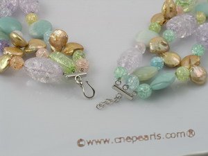 This elegant coin pearl necklace consists of three strands 12mm topdrilled champagne coin pearls, alternately decorated with colorful natural shape snowflake crystal quartz. ended with sterling or silver adjustble clasp. 17"-19" in length