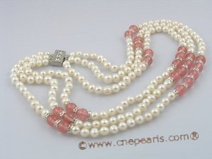 This elegant multi strands necklace is knitted with three rows 6-7mm nature white potato pearl,decorated with 8mm watermelon stone beads with white crystal fittings as ornament; ended with silver clasp; The wear length is 17"-19";