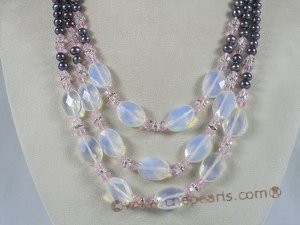 Triple strands black pearl necklace is knitted with three rows 6-7mm black potato shape freshwater pearl, decorated with 13*18mm oval shape moonstone and pink faceted crystal in the middle, with silver beads as spacer; end with silver clasp;The individual strand is 17"-21".