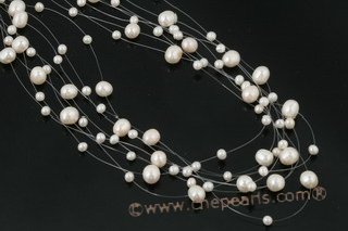 This Lovely floating illusion necklace is connected with colloid lines, made of 4-5mm combine with 8-9mm white freshwater potato pearl. The necklace is featured with eight strands that look like pearls floating in front of you! 17 in length, ended with silver plated copper box clasp.