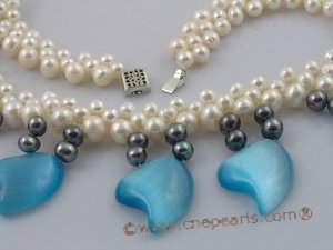pn079 handcraft knitted 6-7mm white and black potato pearl bridal & wedding necklace with blue cat eyes beads [single necklace]  63.58€