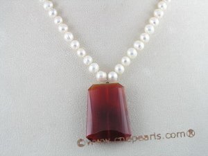 Charmming pearl necklace is double-knotted with 7-8mm white potato shape fresh water pearls; set a ladderlike crystal pendant in the middle making it a special look, end with silver or sterling sivler spring ring clasp; the length is 16", 17", 18" and 20", for your selection.