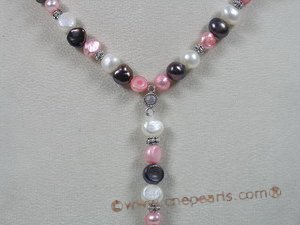 Y-style pearl beads necklace made of 7-8mm multi-color nugget pearl beads alternately silver fittings, ended with sterling silver or sterling toggle clasp. The length is 18" and weight 25g.
