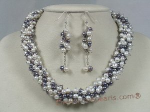 Professionally hand wired grape necklace set wholesale -- the necklace is 17" in length with silver adjustable lobster clasp,hand wrapped with 5-6mm white & 4-5mm black potato pearl, dangling from silver chain with silver pin.