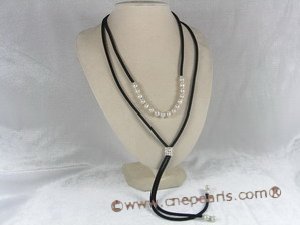 Elegance ribbon necklace featuring 8-9mm white potato culture pearl, alternated with silver cushion fittings as decoration; offset by a black ribbon cord; 48 inch in length; can wear and tie it in any way as you like. Buying similar style necklace: leather cord necklace or ribbon necklace or long necklace