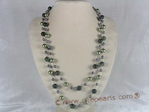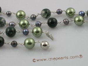 This 48 inches long Shell pearl necklace, alternately thread with 10mm green shell pearls, 10mm moss agate beads and 6-7mm black potato pearls; All the beads are connected with silver needles; end with 8mm silver ball clasp; Buying other jewelry products: long necklace or layer necklace or shell pearl jewelry;