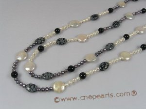 seed pearls rope necklace is threaded with 4-5mm white & black potato pearls beads althernate with 12mm white coin pearls and 10*14mm oval snowflake obsidian stones; decorated with 8mm black agate beads.W/N clasp, 48 inch in length;