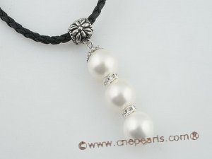 Festive and cheery, this triple pearl pendant necklace featured of three silver plated spacer alternated with three pieces 12mm white round shell pearl, attached to a 16" black leather cord ended with 18KGP lobster clasp with 2inch extended. What a wonderful and versatile piece to give or receive! Also buy other pearl jewelry: Pearl beach jewelry or shell pearls jewelry