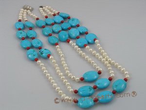 This  neckalace is consisting of three strands  6-7mm potato shape fresheater pearls, alternate with 5mm round coral beads and 20*15mm oval bule turquoise beads. The length is 17"--21". end with silver clasp;