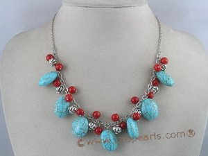 This extraordinary necklace made of 15*19mm blue oval genuine Turquoise stones that are attached to a silver chain, adorned with 8mm red round red coral and silver beads in between. The Turquoise stones are hand strung carefully halfway of the chain and the necklace is secured with a lobster claw clasp. 16 inch in length; A perfect piece to complement your dress.