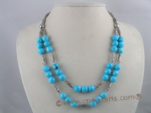 Beautiful layer turquoise necklace featured double strands 10mm round turquoise beads alternated with oval silver pipe beads! ended with sterling or plated silver spring rings clasp and the length is 17"; Alao buy other jewelry: Coral necklaces or Turquoise necklaces or Coral & Turquoise jewelry