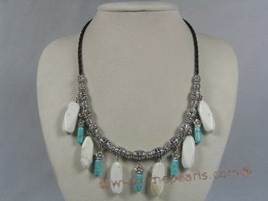 Elegant looking turquoise necklace featured silver fitting dangling with 12*30mm white alternated with 6*15mm blue tubby turquoise; threaded with a 16inch black ripple leather and end with an adjustbale lobster clasp; The length of necklace is 16";