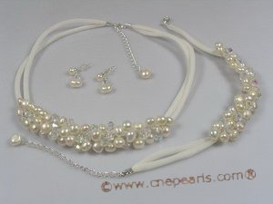 Charming bridal jewelry set consist of necklace,a 7.5 inch bracelet and a pair studs earrings, This set threaded with ribbon cords, featured 6-7mm white potato seed pearl beads and faceted rhinestones. The necklace measures 16 inches long with an extender chain for just the right fit. Shopping other style bridal jewelry: bridal jewelry set or bridal comb jewelry or bridal pearl tiara