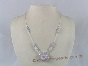 Fashion cubic zircon necklace, colloid lines thread with light purple zircon beads and faceted crystal beads, set a 28mm 3layers flower design zircon pendant in the middle, silver beads as spacer;16inch in length and end with silver magnetic clasp; Also buy other zircon jewelry: zircon necklace or zircon bracelet or zircon rings